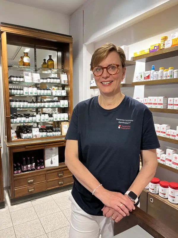 Mein Name ist Susanne Schleyer, Apothekerin und Inhaberin der Apotheke Stahnsdorf und der Kronenapotheke Teltow. Seit 1994 bin ich mit meinen Apotheken in Stahnsdorf und Umgebung für die Menschen da – verlässlich in der Versorgung und persönlich in der Beratung.